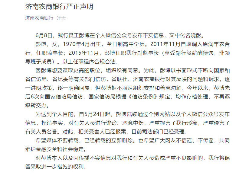 声明发布后,彭博在个人公众号上再度公开文章“开怼”济南农商银行。其表示,“济南农商行并没有正面回应我举报的所有问题,包括隐瞒30亿大案的问题,包括领导情妇火速升迁问题、包括领导为妻子改档案问题、包括违规突击提拔干部问题、包括给空壳公司贷款百亿并吃回扣的问题。”