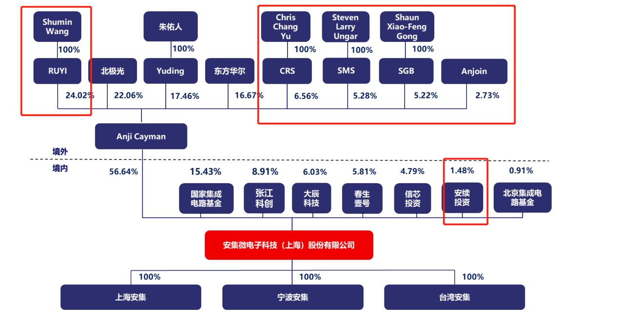 安集科技创始人包括王淑敏、俞昌、Shaun Xiao-Feng Gong、Steven Larry Ungar四人,第一大股东为Anji Cayman(即Anji Microelectronics Co., Ltd),持有IPO前56.64%的股权。据招股书,Anji Cayman的股东层面还包括了知名风投北极光创投,其持有Anji Cayman 17.64%的股权;而安集科技的创始人王淑敏、俞昌则各自并通过境外员工持股平台Anjoin合计持有Anji Cayman 43.81%的股权。