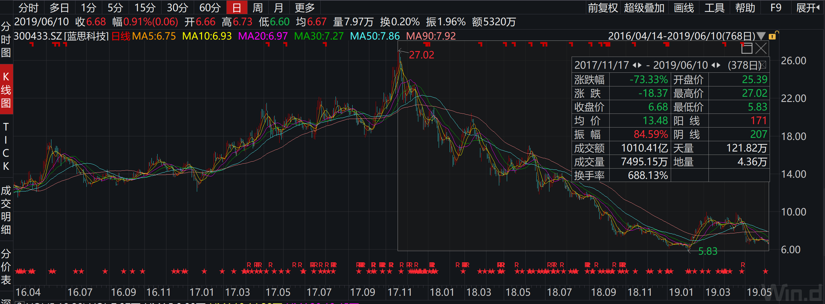 下游客户的集中度也构成一个市场风险。中芯国际单一客户贡献公司业务收入的比重接近60%。一旦中芯国际降低采购额,意味着公司收入将会大幅滑坡。客户集中度过高最典型的例子是苹果产业链的蓝思科技(300433.SZ),由于苹果销量下滑,蓝思科技市值缩水73%。