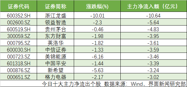 沪深两市共计67只个股主力净流出额超1亿元。浙江龙盛(600352.SH)、领益智造(002600.SZ)、贵州茅台(600519.SH)主力流出额位居前三,分别为10.64亿元、5.64亿元、4.83亿元。