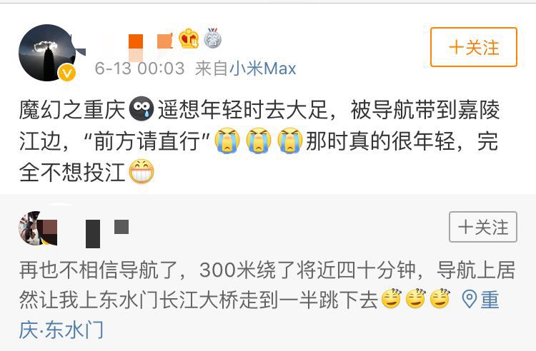 6月12日至13日在重庆游玩的邢女士,一度被导航逼哭。怕黑的邢女士12日晚间跟着导航穿过许多漆黑的巷子,最后走进一个死胡同里,一直绕不出去。“明明已经十分努力地跟着导航走了,但就是走不出去,无数次的走错路,情绪一下子收不住就开始爆哭。”邢女士说。