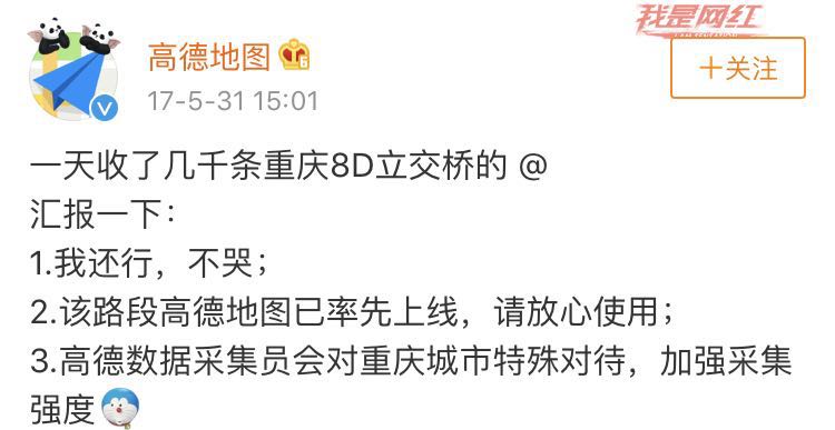 2017年5月底,5层落差、8个方向、20条匝道的黄桷湾立交桥全部完工,重庆也被戏称成为了“8D城市”。当时不少网友聚焦在立交桥的导航问题上,高德地图还特地发声,称该路段的地图已率先上线,并会对重庆特殊对待,加强采集强度。
