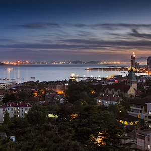 从高空俯瞰,青岛是一座三面环海,山、海、城有机融为一体的海滨城市。悬崖峭壁、沙滩礁石、碧海蓝天、红瓦绿树,一幅幅城市画卷跃然于眼前;弯弯曲曲、千姿百态的海岸线,更是勾勒出岛城独有的百看不厌的自然景观。