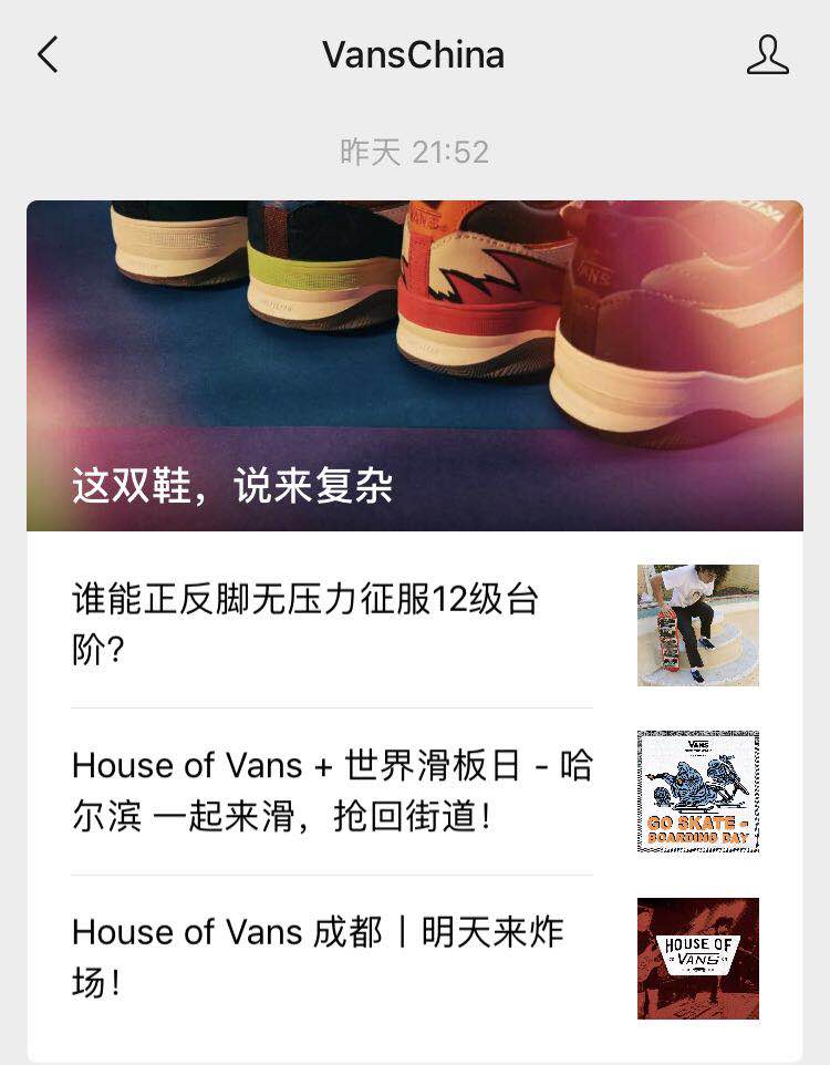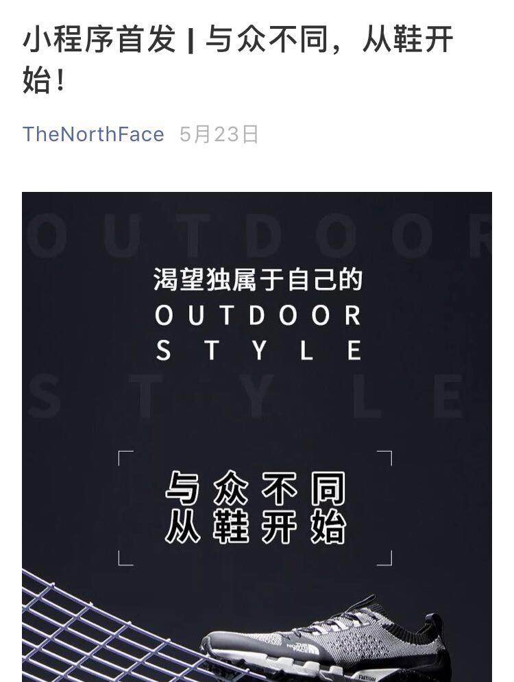 经常举办线下潮流活动和比赛的VANS,会在微信公众号上实时跟进新活动的讯息,并分享关于潮人们的故事。The North Face在2018年推出了微信购买小程序,用来首发限量款尖货。
