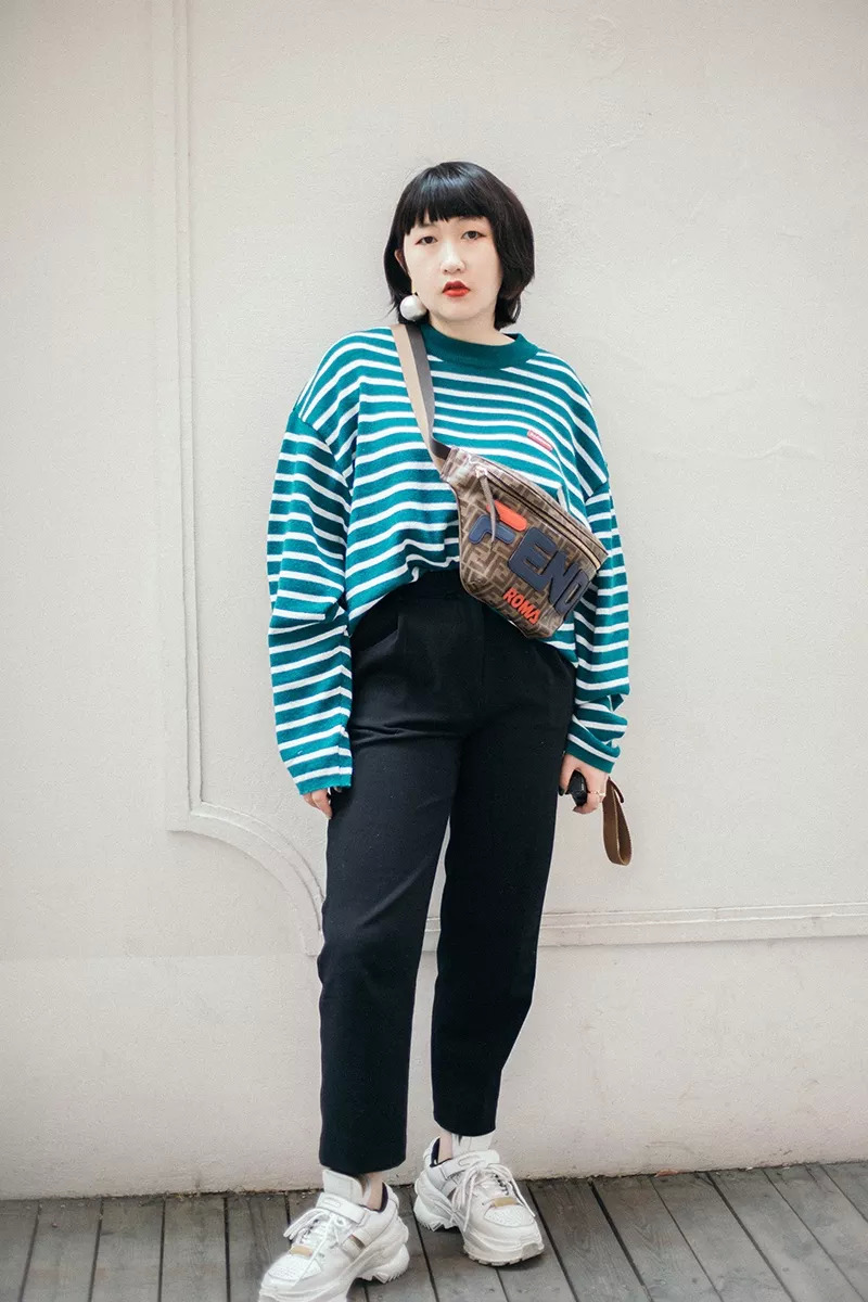 普通的工作一日,于是穿搭也是最普通的样子。用经典条纹针织衫,搭skinny的烟管裤搭配大头鞋,松紧配,显腿瘦!