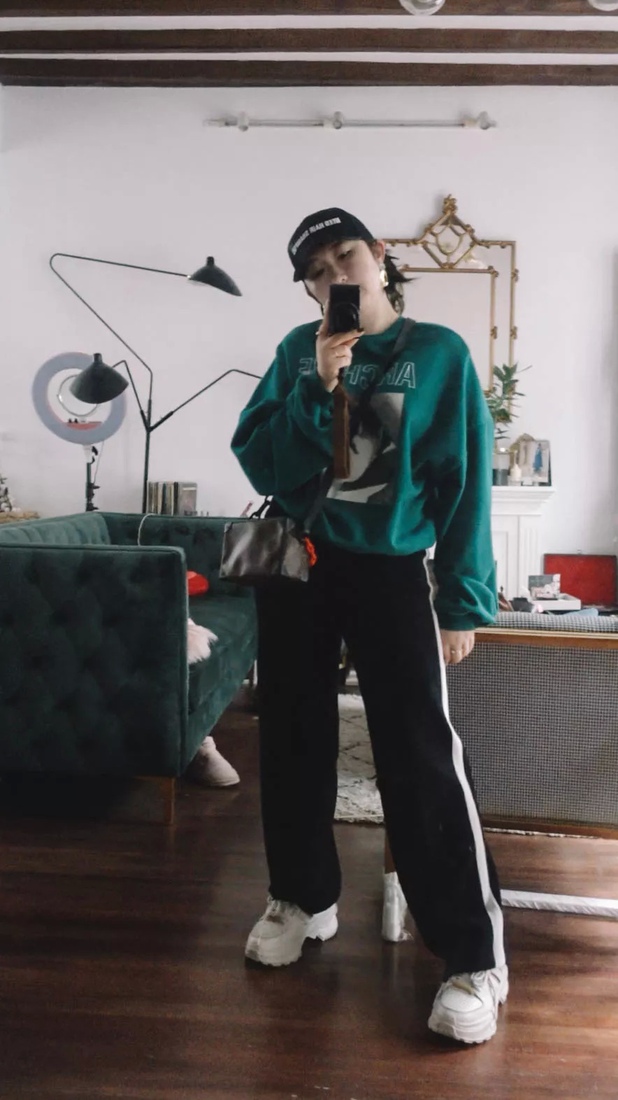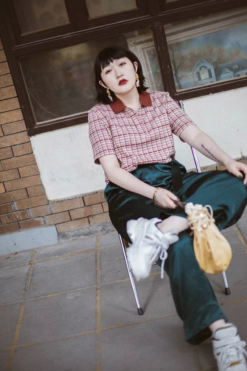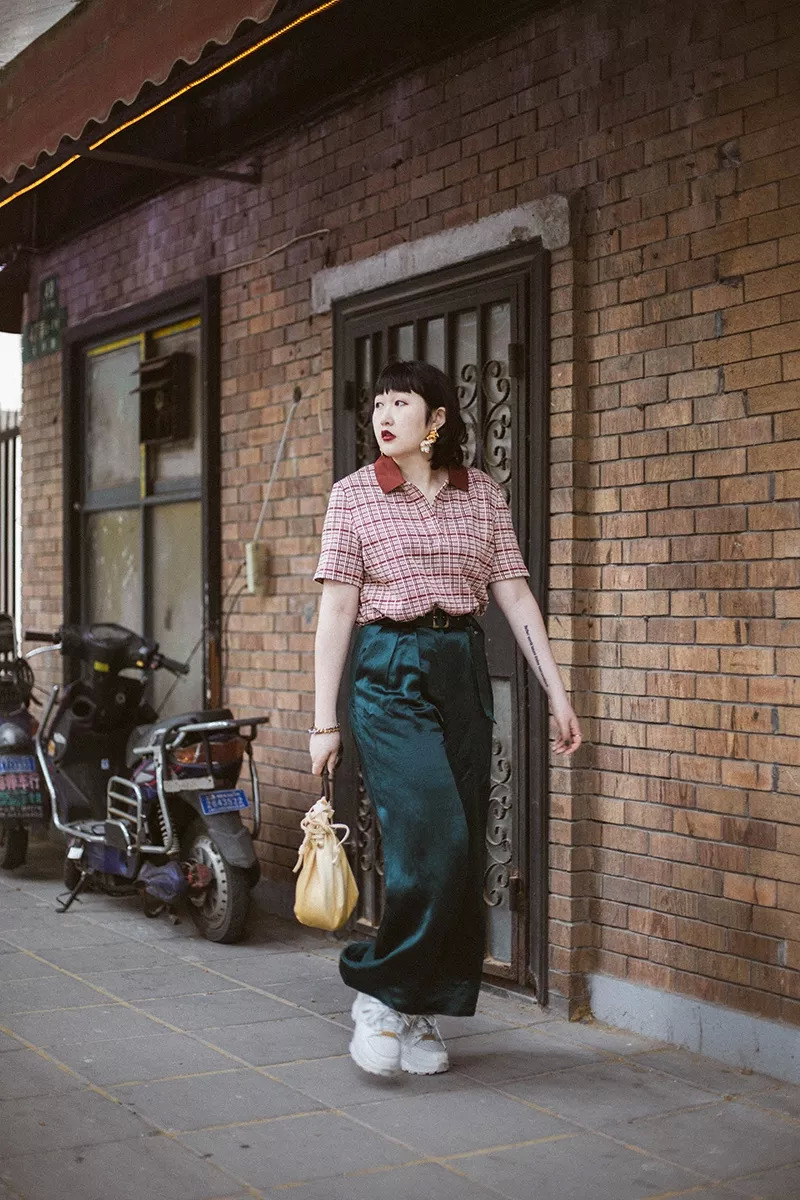 第二身,砖红色的polo衫&缎面绿阔腿裤,走的是我一贯喜爱的红绿配,复古撞色。