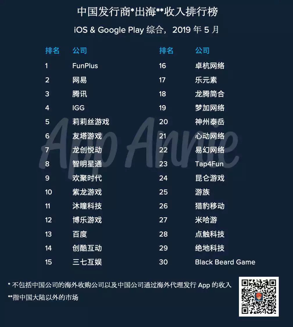 近日,App Annie发布了2019年5月中国发行商出海收入榜Top30。