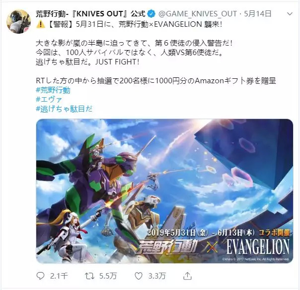 以《荒野行动》为例,它不仅在5月份围绕“令和元年”和“2500万玩家数”等话题展开了一系列的运营活动,它还甚至在5月中旬公布了联动日本国民级动漫IP《EVA》的消息,以此达到极为有效的营销推广效果。