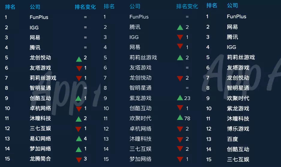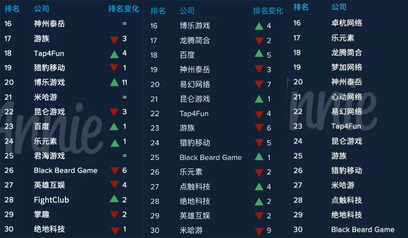 而进入Top16-30的则有15家,包括乐元素、神州泰岳、心动网络、Tap4Fun、昆仑游戏、游族、猎豹移动、米哈游、点触科技、绝地科技、Black Beard Game、英雄互娱、君海游戏、FightClub、掌趣。