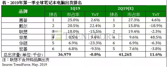 全球市场研究机构集邦咨询最新笔记本电脑出货报告显示,2019年第一季度,苹果笔记本电脑出货量为315万台,市占率为8.5%,在全球排名第四。