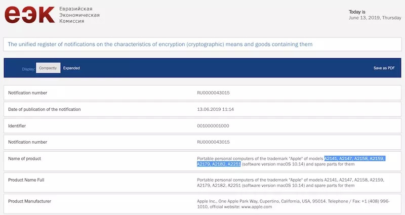 6月14日,外媒发现,苹果在欧亚经济委员会数据库中注册了7个尚未发布的Mac型号,分别为A2141,A2147、A2158、A2159、A2179、A2182、A2251。
