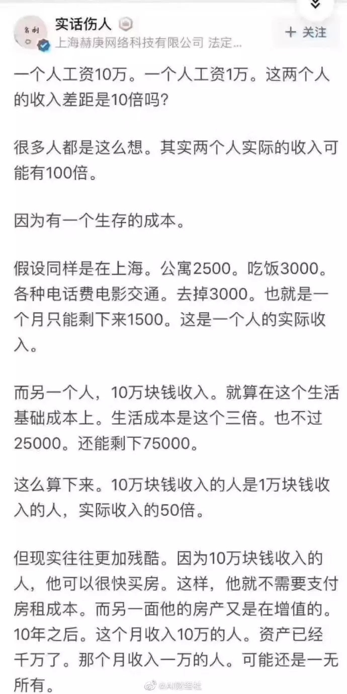 有人在网上发起了“月薪1万与月薪10万真实差距”的帖子。