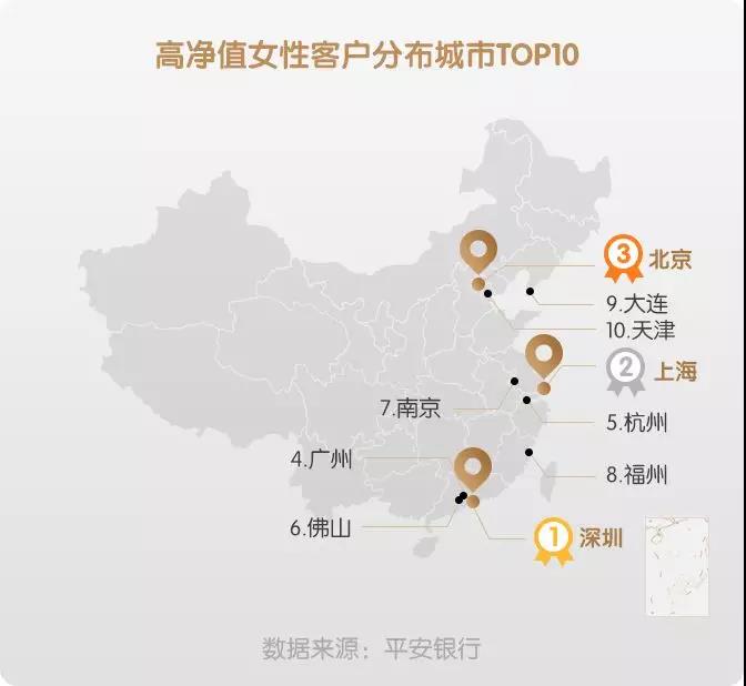 地域方面,女性高净值客户大多分布在华东和华北地区,除了北上广深一线城市外,杭州、南京等城市也跻身前十,从侧面反映了新一线城市财富人群的迅速增长