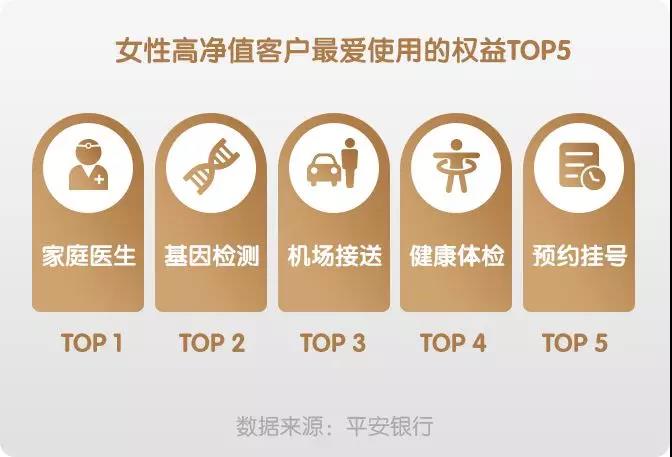 在客户权益的使用率上,女性高净值客户明显多于男性。数据显示,在平安银行私人银行提供的客户权益中,女性客户使用占比均超过60%的有9项。其中家庭医生、基因检测等健康权益最受女性客户欢迎,这体现了高净值女性关爱家人,对家人健康尤为关注。机场接送服务是高净值女性偏好的另一项权益,体现她们对安全、快捷出行的需求。