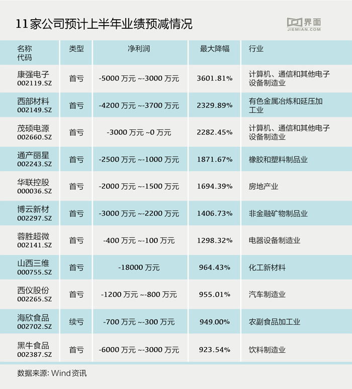 在这些净利润下滑公司中,有59家公司预计净利润下滑超过100%。其中,康强电子(002119.SH)、西部材料(002149.SZ)、茂硕电源(002260.SZ)、通产丽星(002243.SZ)、华联控股(000036.SZ)、博云新材(002297.SZ)、蓉胜超微(002141.SZ)、山西三维(000755.SZ)、西仪股份(002265.SZ)、海欣食品(002702.SZ)和黑牛食品(002387.SZ)等11家公司预计今年上半年归属于上市公司股东净利润最大降幅将超过900%。