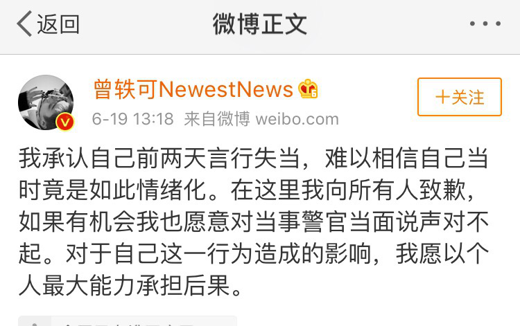 事情的起因在6月17日,曾轶可在微博发文称遭到首都机场工作人员的为难。并随后晒出机场工作人员的警号和个人信息。6月19日,北京出入境边防检查总站官方微博@北京边检通报“曾轶可事件”称,系当事人不配合面相对比,对民警爆粗。在边检事件之后,曾轶可很快出面道歉,并在今日(6月20日)用小号再次道歉并回顾了事件始末。