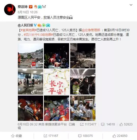 从6月11日开始,蔡徐坤不管是直发微博还是转发微博,没有一条转发、评论达到100万+,6月18日为灾区祈福的微博,转发17万,评论近11万,转发缩水近6倍,评论缩水近10倍。