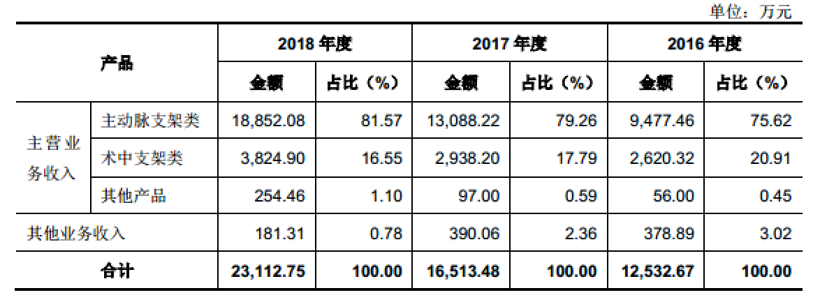 心脉医疗主要从事主动脉及外周血管介入医疗器械的研发、生产和销售,在主动脉介入医疗器械领域,公司的主要产品为主动脉覆膜支架系统;在外周血管介入医疗器械领域,目前拥有外周血管支架系统、外周血管球囊扩张导管等产品;另外,心脉医疗拥有国内唯一获批上市的可在胸主动脉夹层外科手术中使用的术中支架系统。2018年的营业收入和净利润分别达2.31亿元和9064.79万元的规模。