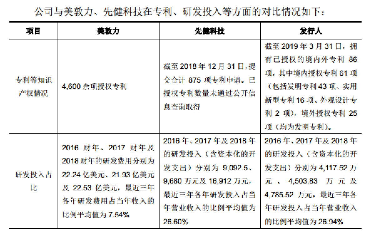 图中可见,先健科技拥有875项专利,就数量来说是心脉医疗的10倍;美敦力更甚,手握4600余项授权专利,还远远超过先健科技。再看研发费用的投入,先健科技在最近的2018年投入了1.69亿元,是发行人的3倍多,而美敦力在2018财年的研发费用为22.53亿美元,完全不是一个数量级。为这事,保荐机构还专门为心脉医疗的“含科量”站台背书。