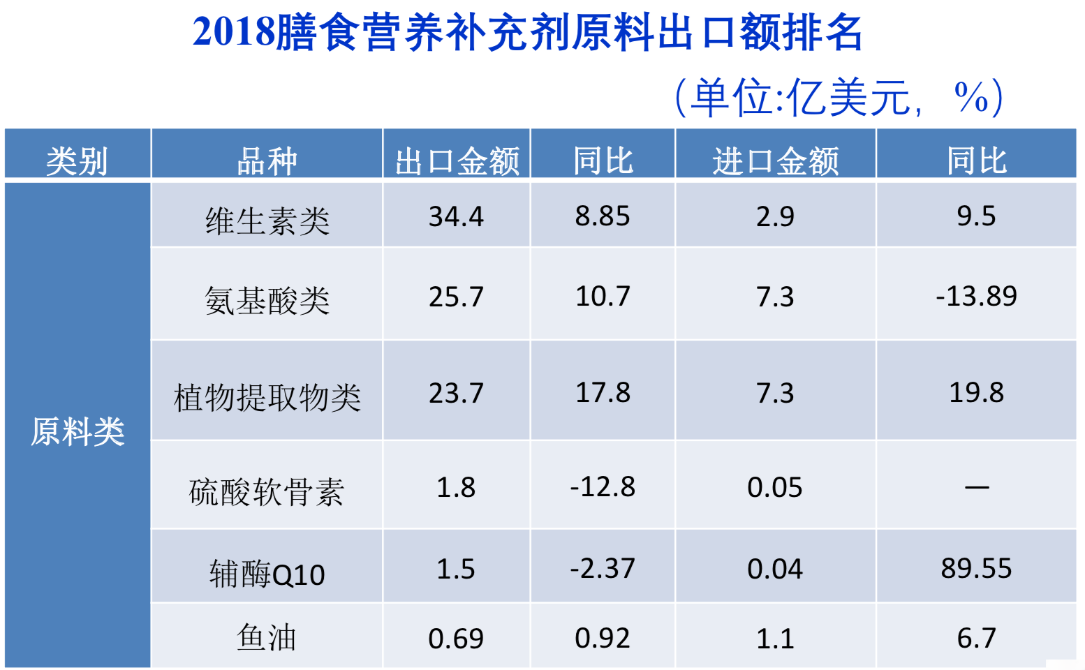与药品行业类似的是,在膳食营养补充剂上中国也同样上原料的生产与出口大国。美国则是最大的原料出口市场。从品种上看,维生素类、氨基酸类、植物提取物类是中国保健品原料出口的主要类别,三者合集出口金额在85亿美元左右,其中维生素类为原料出口的第一大类别,其次为氨基酸类。