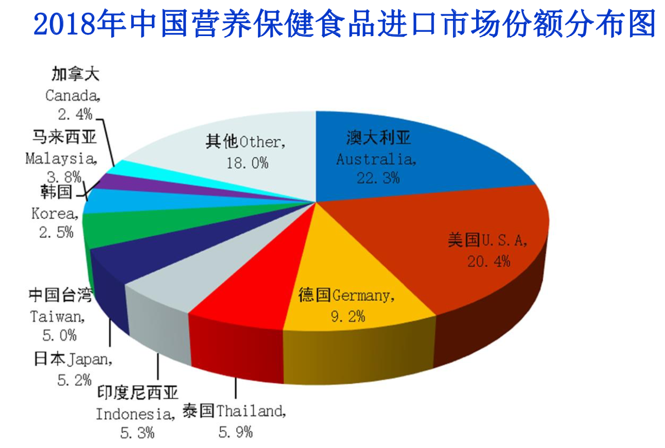 从进口情况看,由于出色的市场推广,澳大利亚以22.3%的市场份额,首次超越美国成为国内保健品进口的第一大进口市场,美国以20.4%位居第二。氨基酸类、植物提取物类、维生素类也是进口相对大的类别。