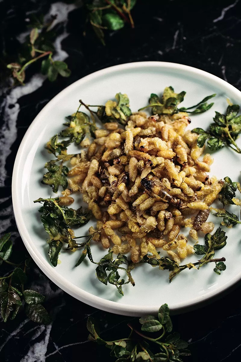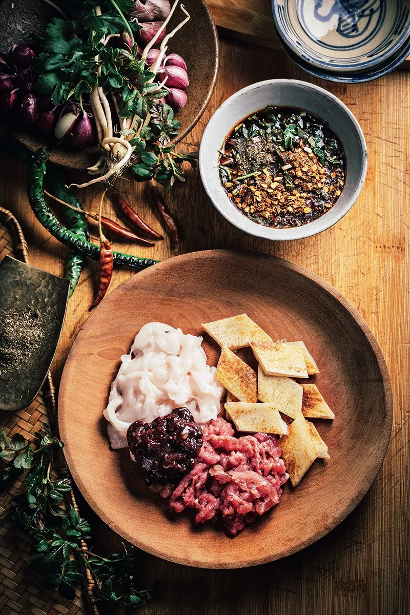 如: 拌了蒜汁、花椒、薄荷等作料的白旺 (生羊血),清晨刚从市集上“片” 下来的新鲜生猪皮,价格竟比猪肉贵,再瞧那碟鲜亮、明艳的蘸水,倘若飘着生肉糜你也不必咋舌,那可正是云南最地道的“剁生”。倘若你赶在 3 月底到 4 月初的好时候到访,主人家必然是要端上一盘黑白相间,像芝麻粒一般的当季新鲜佳肴—“蚂蚁蛋”,那可绝对是把你当宾上座的珍馐佳肴。