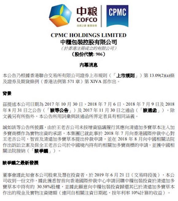 今天早上,中粮包装(00906.HK)发布公告披露,其于6月21日收到一份文件,获悉智首向香港国际仲裁中心申请回购中粮包装投资于清远加多宝草本持有的30.58%股权,并据此愿意向中粮包装投资归还其已于清远加多宝草本作出的现金及实物注资总额(连同自相关注资日期起,按年利率 10%计算的收益)。