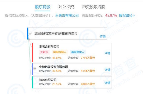 小食代今天查询工商信息看到,清远加多宝草本植物科技有限公司目前有三大股东,按持股多少依次排名为:王老吉有限公司持股比例为45.87%;中粮包装投资有限公司持股比例为30.58%;智首有限公司23.55%。