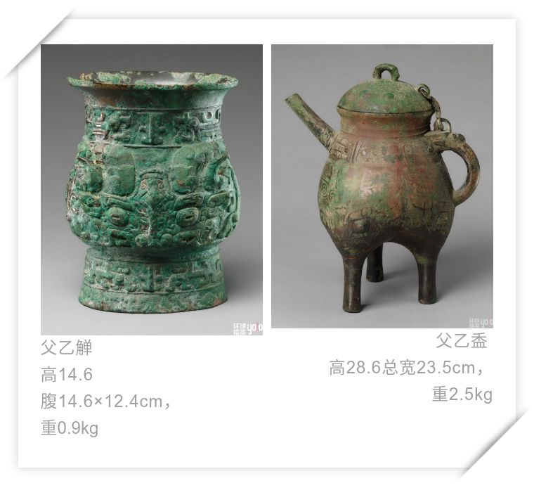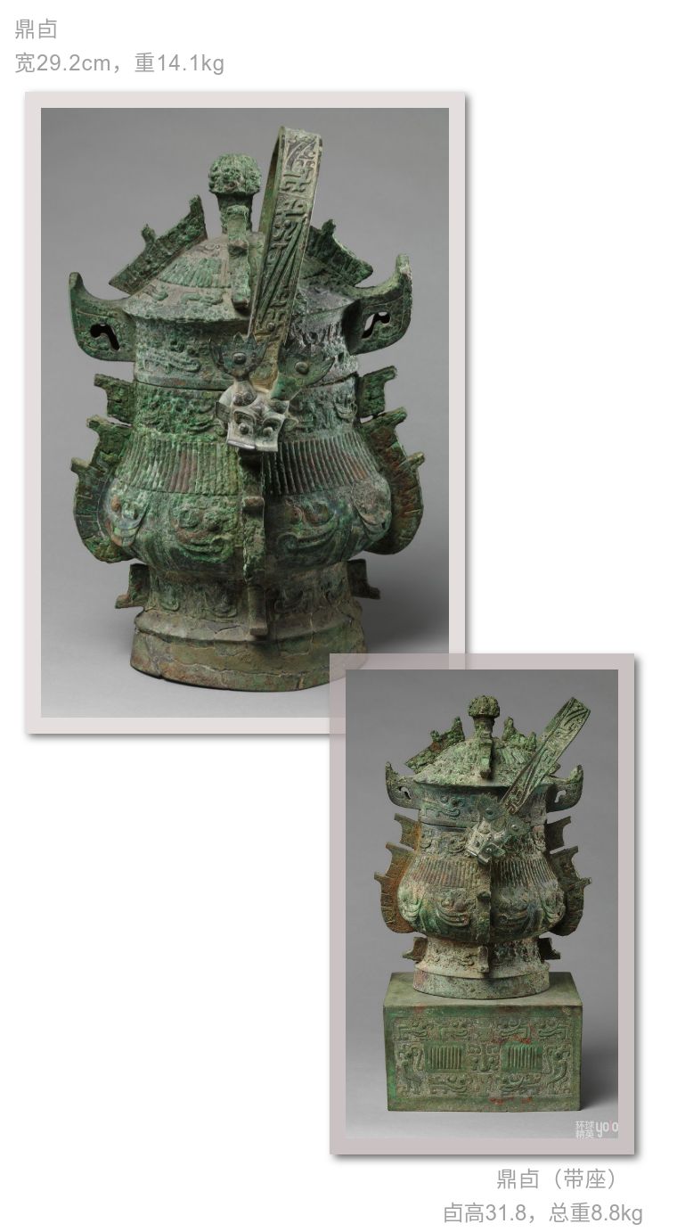 居中的尊,侈口,直腹,圈足,四面有扉棱,主体纹饰为兽面纹,高三十四点八厘米。这三件较大的酒器,都铸铭文“鼎”字。又有一勺,据云出土时在卣中。另有斝(jiǎ)、盉(hé)、觚(gū)、爵、角各一件,觯(zhì)四件和匕六件,均为宝鸡附近出土,有的可能与禁同出,但情况与二卣一尊及勺有所不同。