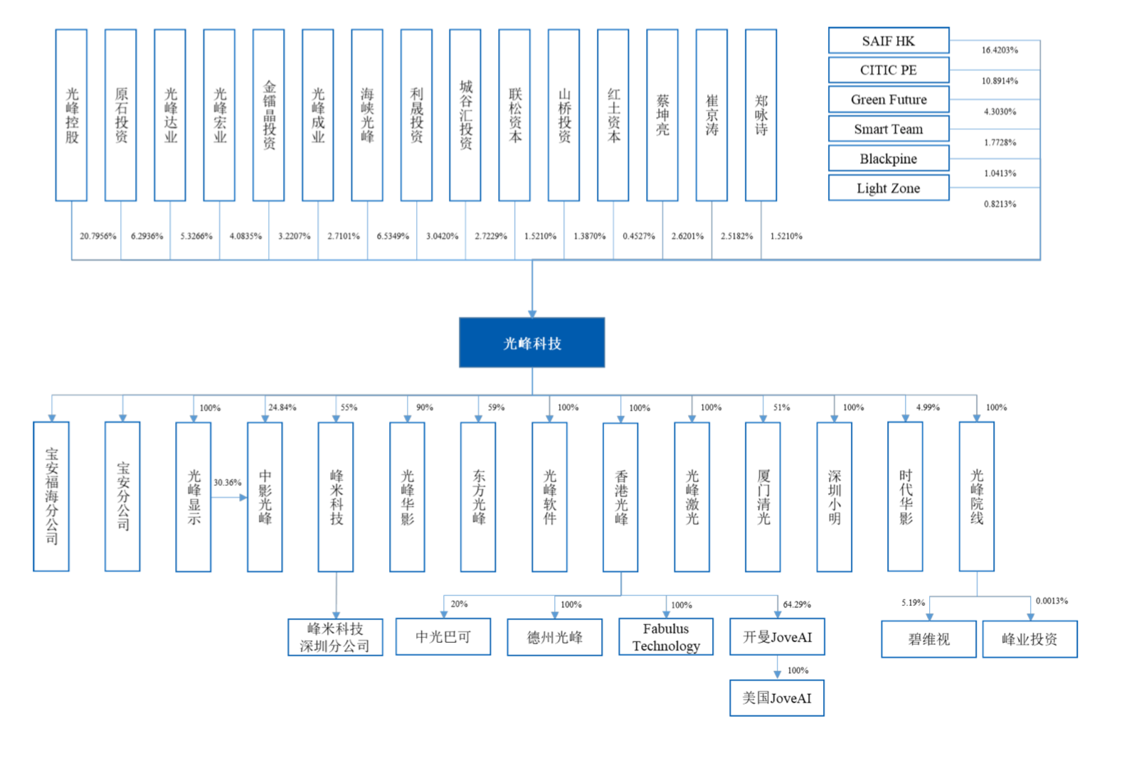 光峰科技成立于2006年8月6日,前身为深圳市光峰光电技术有限公司,2018年8月,变更为光峰科技股份有限公司。成立伊始,光峰科技注册资本为10万元,后经多次增资,注册资本增至目前的3.84亿元。实控人李屹通过光峰控股、原石投资等公司合计持有光峰科技43.43%股份。