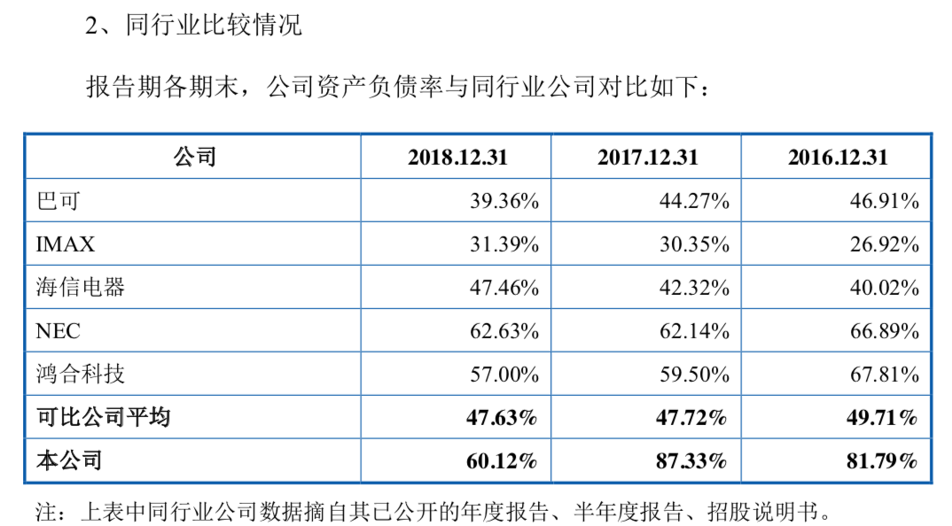 过去三年,光峰科技负债率整体下降不少,但仍显著高于同业平均值。2016年-2018年,光峰科技负债率分别为81.97%、87.33%以及60.12%。上述三年间,同业公司平均负债率分别为49.71%、47.72%以及47.63%。