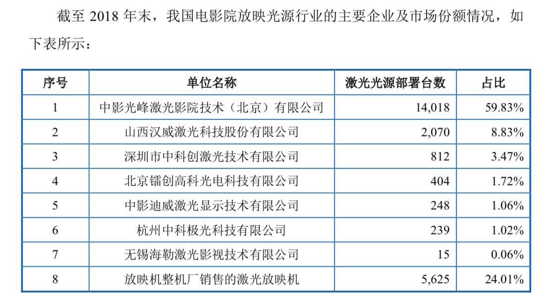 根据中国电影发行放映协会数据,2018年末我国电影放映厅总数为60079个,安装激光电影放映设备23431台,占比39%;光峰科技激光电影放映机光源已在全国部署14018套,市场占有率为59.83%。