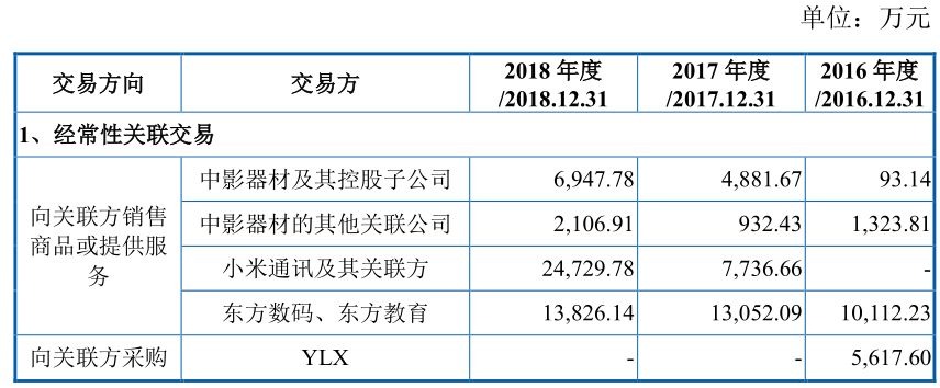 招股书显示,2017-2018年,小米通讯分别占据光峰科技第三、第一大客户,销售额分别为7736.66万元、2.47亿元,分别占当期激光电视营收的95.92%、80.72%,占主营业务收入的9.6%、17.85%。中影器材均位列光峰科技第四大客户,销售金额分别为5814.11、9054.68万元,占主营业务收入的7.22%、6.53%。东方教育(东方数码子公司)分别占据第三及第二大客户,销售收入分别为1.31亿元及1.38亿元,占营业务收入的16.2%与9.98%。
