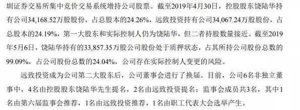根据公司6月13日发布的《2014年公司债券(第一期)2019年跟踪信用评级报告》所显示,截至2019年5月6日,饶陆华持有的3.39亿股公司股份处于质押状态,占其所持公司股份总数的99.09%,公司存在实际控制人变更的风险。远致投资成为公司第二大股东后,公司董事会也进行了换届。目前公司6名非独立董事中,2名由远致投资提名,监事会成员共3名,1名由远致投资推荐,说明远致投资早已为入主公司做好准备。
