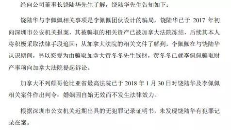 从公告可知,饶陆华认为他的那场跨国婚姻是一场团伙骗局。1965年出生的饶陆华在国内有妻子和两个儿子。自1996年公司创立起,他的妻子就一直在公司任职,曾担任公司副总裁,后于2018年11月因个人原因辞职,并且未持有公司股份。
