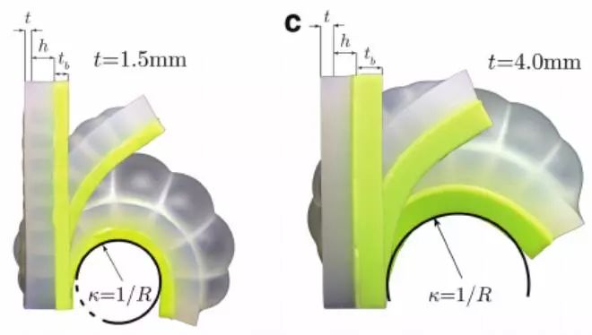 比如将三根直径为0.79mm、长度相同的管子接在机器人上,再接通一根直径为0.38mm的长管输送气流。它其中的一条“腿”就能充满空气并弯曲起来,而另外三根上接通的管道由于直径更粗并且长度相同,因此输送压缩空气的时间较短,其余三端可几乎同时鼓起落下。