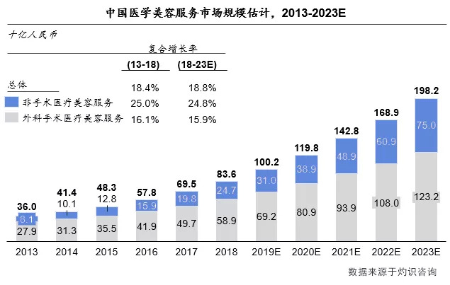 据灼识咨询数据统计,中国总体医学美容服务市场规模(所指下游服务市场不包括上游和中游)从2013年人民币360亿元增长到2018年人民币836亿元,年复合增长率为18.8%。