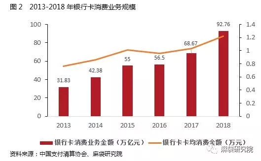 伴随着发卡量的激增,持卡消费也获得了快速增长。2013-2018年,银行卡消费业务金额实现了三倍增长。同时银行卡卡均消费金额数据显示,六年间卡均消费从0.76万元上升至1.22万元,体现出我国银行卡发卡数量扩张带动的消费规模剧增: