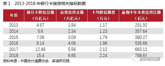 银行卡数量、银行卡消费业务的双增,推动了银行卡授信总额的攀升。中国支付清算协会数据显示,六年间银行卡授信总额从4.57万亿元增长至15.4万亿元,而在贷余额亦实现了跨越式增长,从2013年的1.84万亿元激增至2018年的6.85万亿元,如表1所示:
