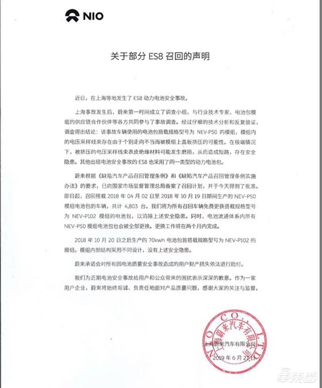 车东西6月27日下午消息,在连续出现3起自燃事故后,蔚来汽车今日宣布召回部分批次ES8电动汽车,共计4803辆,将为这些车辆免费更换搭载新型模组的电池包,以消除起火隐患,更换工作将在两个月内完成。