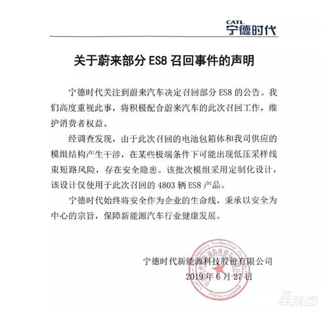 今天下午,就在蔚来发布召回公告后不久,其电池模组供应商宁德时代也发布公告回应此事,称宁德时代提供的电池模组结构与电池包箱体产生干涉,在某些极端条件下可能出现低压采样线束短路风险,存在安全隐患。