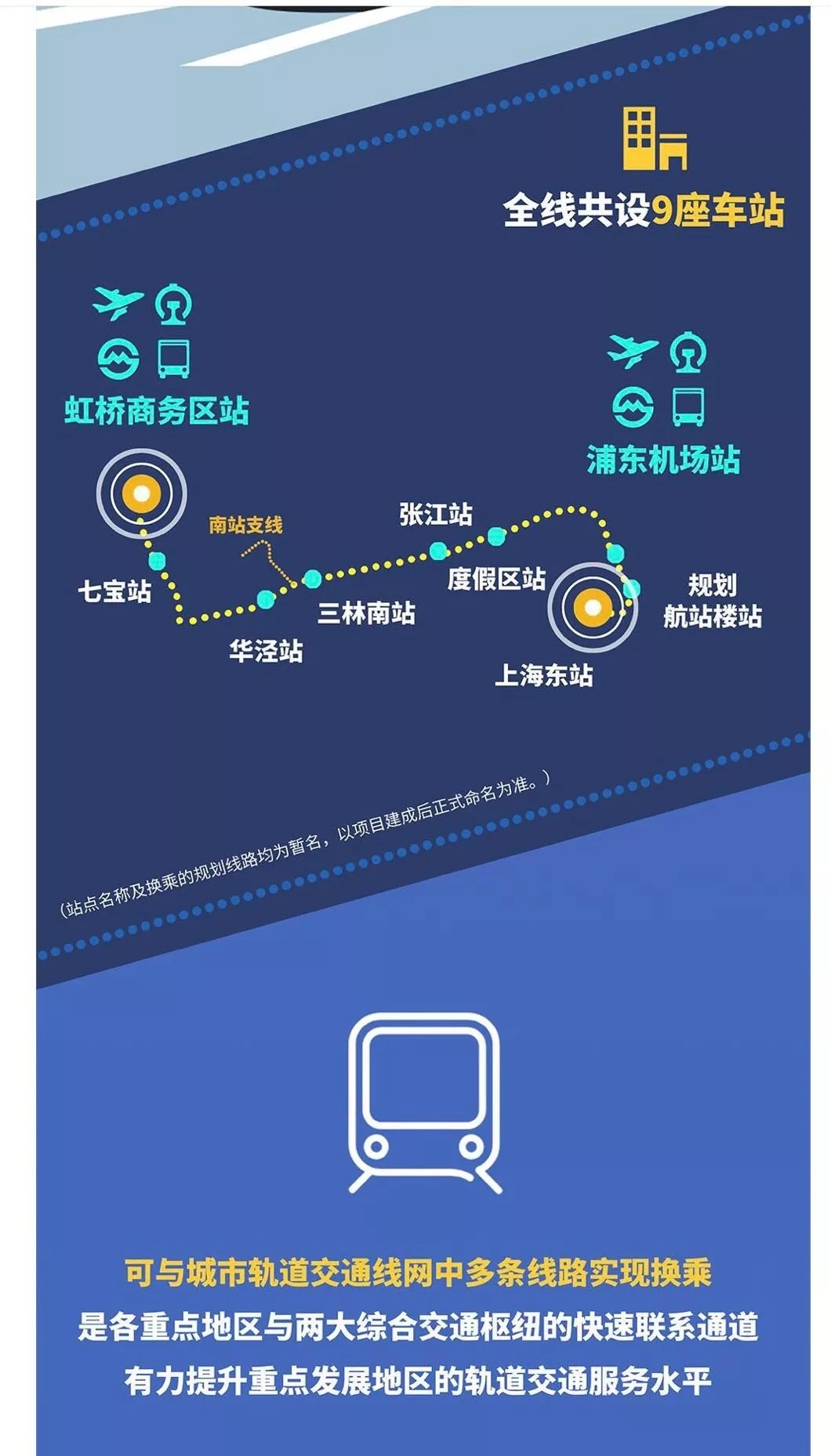 根据批复的专项规划,设虹桥站(既有)、七宝站、华泾站、三林南站、张江站、度假区站、浦东机场站、浦东机场规划航站楼站、上海东站共9个车站。其中,七宝站与既有9号线中春路站换乘。华泾站与在建15号线和规划19号线换乘。三林南站预留了规划19号线及奉贤线换乘条件。张江站预留了与规划21、27号线换乘条件。浦东机场站与轨道交通2号线和磁浮线换乘。