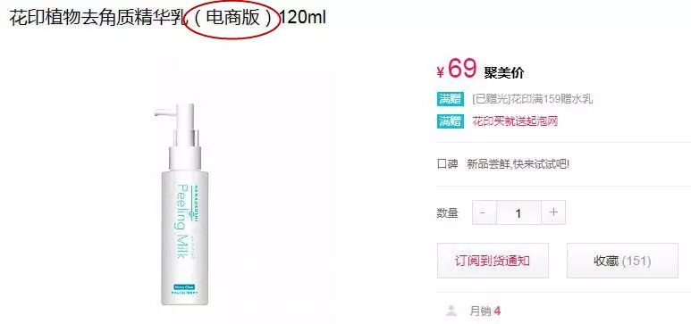 与此同时,一些店铺开始有意无意地去掉“电商特供”的标签,消费者购买时并不知道该款产品是否为“电商特供”, 除非特意询问客服。例如,名称为“花印植物去角质精华乳”的产品,在花印聚美优品旗舰店标有“电商版”的字样,在花印天猫旗舰店则没有,但询问客服又会被告知该产品只在线上出售,线下确实没有卖。
