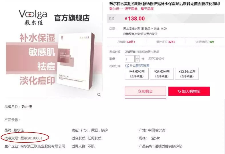 再比如,敷尔佳的一款医用透明质酸钠修护贴,其院线版为械字号面膜,属于医疗器械,其电商版的批准文号为妆字号,属于普通化妆品。据客服介绍,这两款面膜是一样的,只不过前者主要供医院、美容院等线下渠道,后者仅供线上。但实际上,网页上并未有任何地方标明该款面膜为“电商专供”款。