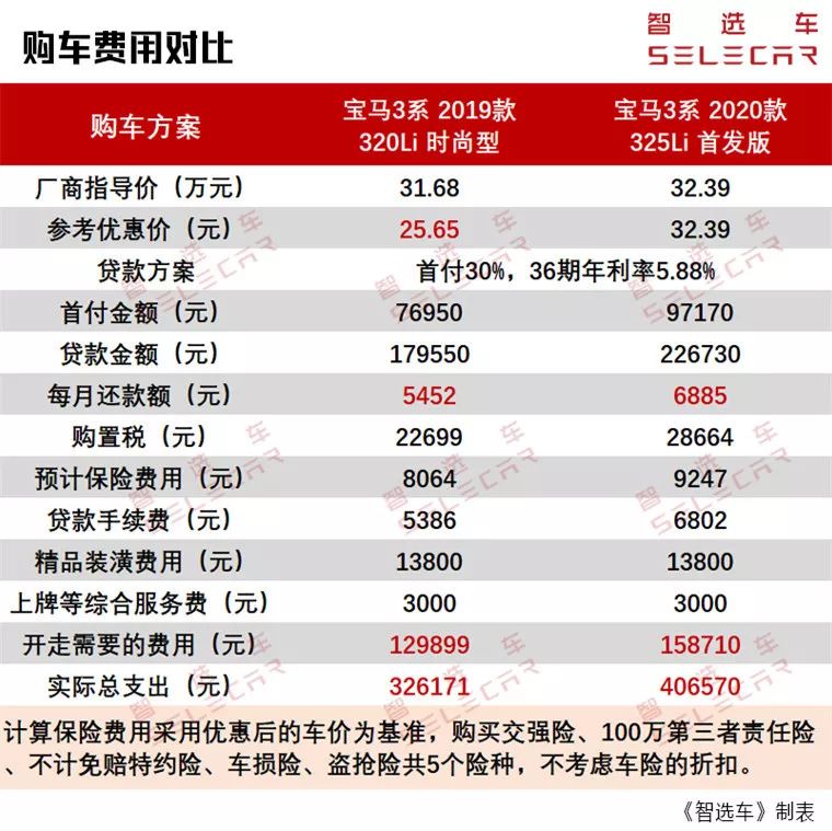 最终按照贷款方式计算,如果现在购买2019款宝马3系 320Li时尚型总共需要支出大约32.6万元;购买2020款 325Li首发版总共需要支出大约40.6万元,购车成本的差异达到了8万元。