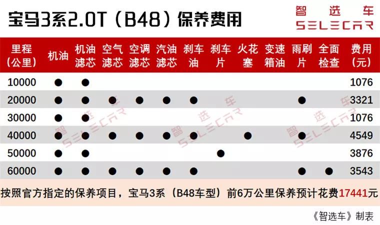 最终按照官方保养方案,宝马3系2.0T(B48)车型的前6万公里保养费用为17441元。这个费用看上去有些高,但是不要忘了其中包含了3次雨刷片更换和1次前后刹车片更换。另外如果加入了宝马的“长悦保养回馈计划”,3年之后车主在保养时还能获得一些折扣。