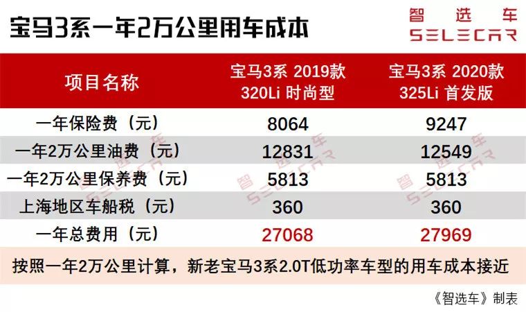 在得知了宝马3系的保险、保养和燃油费用后,我们已经可以大致计算出宝马3系一年2万公里的用车成本。2019款车型由于实际的车价更低,所以在保险费用方面更有优势;而2020款车型的油耗略有下降,油费更省一些,可以预见新老宝马3系每年的用车成本基本一致。