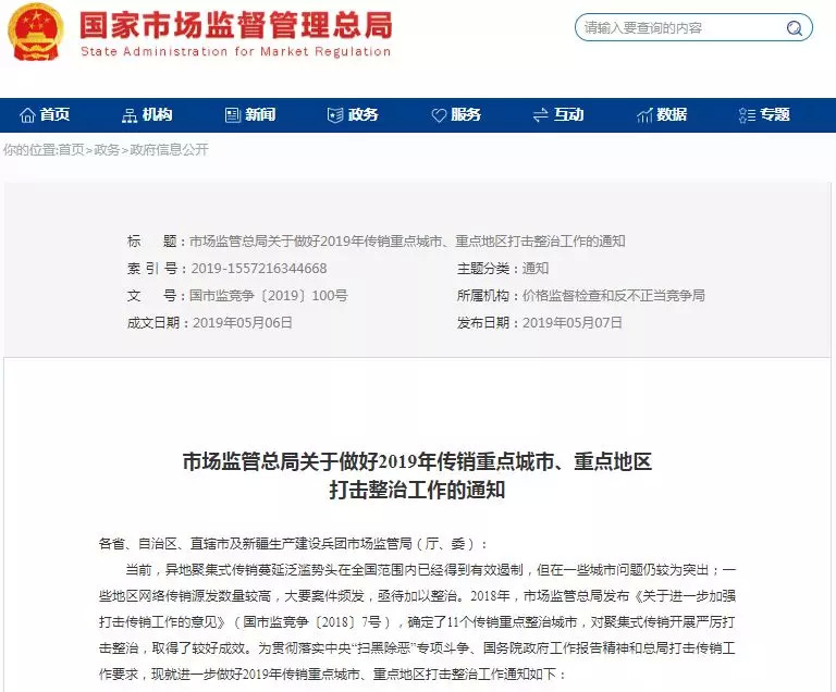 5月6日,国家市场监管总局下发《关于做好2019年传销重点城市、重点地区打击整治工作的通知》(国市监竞争〔2019〕100号)(下称《通知》),作出打传工作部署。