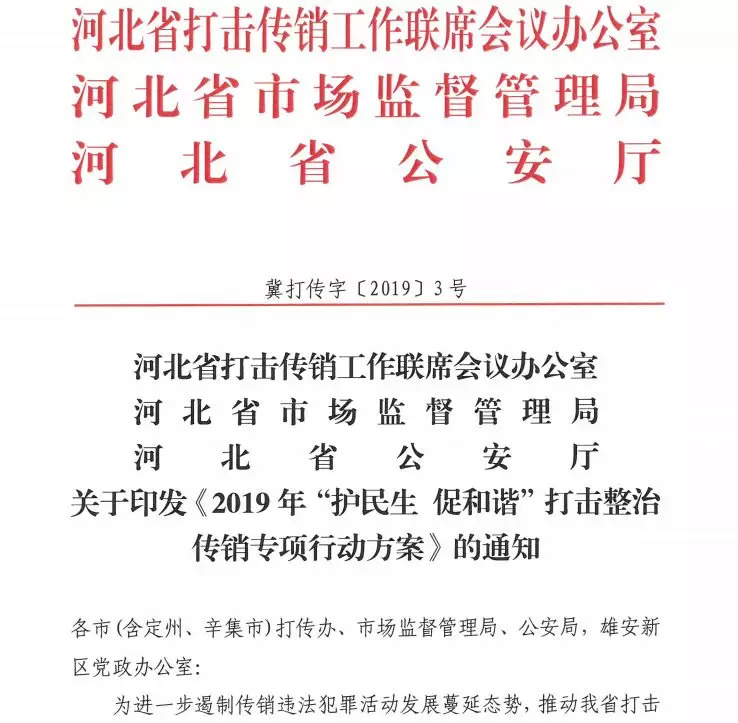 6月25日,河北省还针对省内情况单独召开会议,印发《 2019年“护民生 促和谐”打击整治传销专项行动方案》,将集中整治人民群众反映强烈、传销活动突出的区域,秦皇岛、廊坊位列其中。