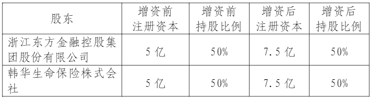 今日,中韩人寿保险有限公司(以下简称“中韩人寿”)披露公告,表示董事会已审议通过其增资方案,由股东浙江东方金融控股集团股份有限公司(以下简称“浙江东方”)与韩华生命保险株式会社(以下简称“韩华保险”),按比例增资(各占50%),增资后,中韩人寿注册资本由10亿元提升至15亿元。